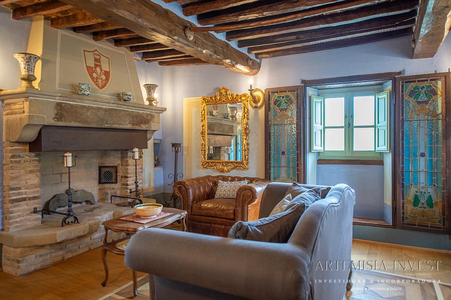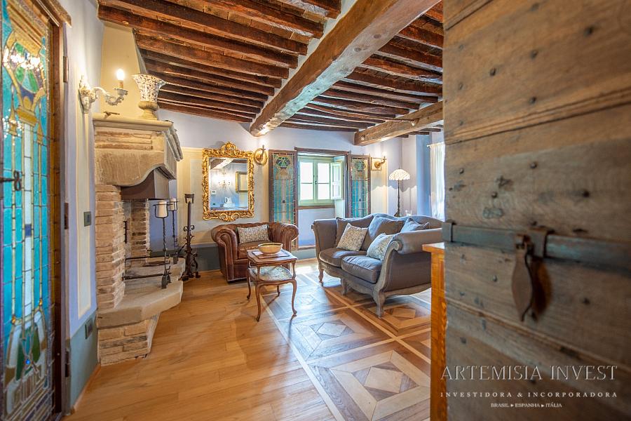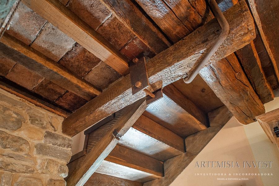 • A restauração manteve as características originais da construção, incluindo tetos com vigas de madeira aparentes e pisos de madeira com detalhes geométricos no primeiro andar. As paredes em tons suaves e quentes criam um ambiente luminoso e acolhedor. Lareiras antigas foram restauradas e adaptadas para funcionar com sistemas modernos de aquecimento por bomba de calor. Toda a casa conta com sistemas de irrigação, iluminação e videomonitoramento controláveis à distância.