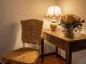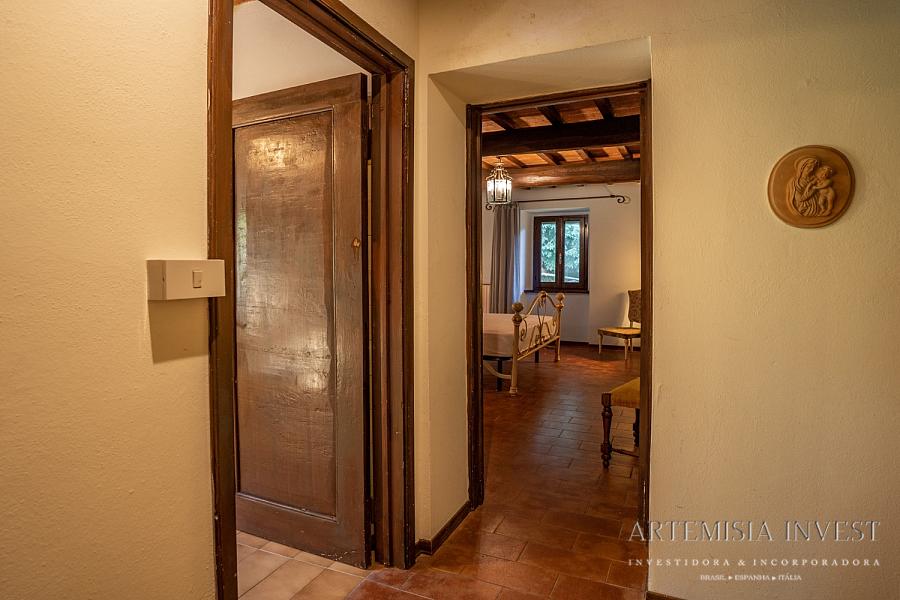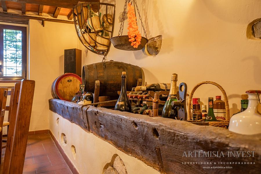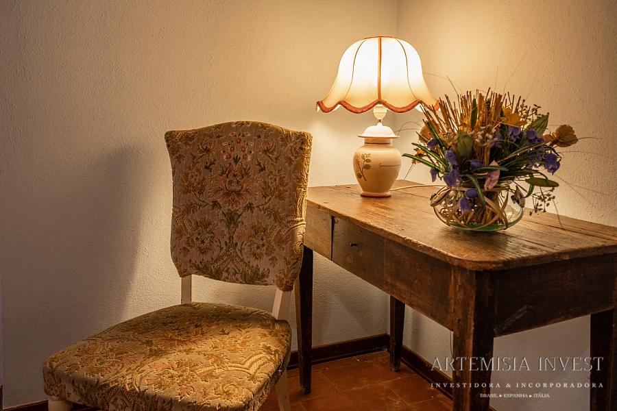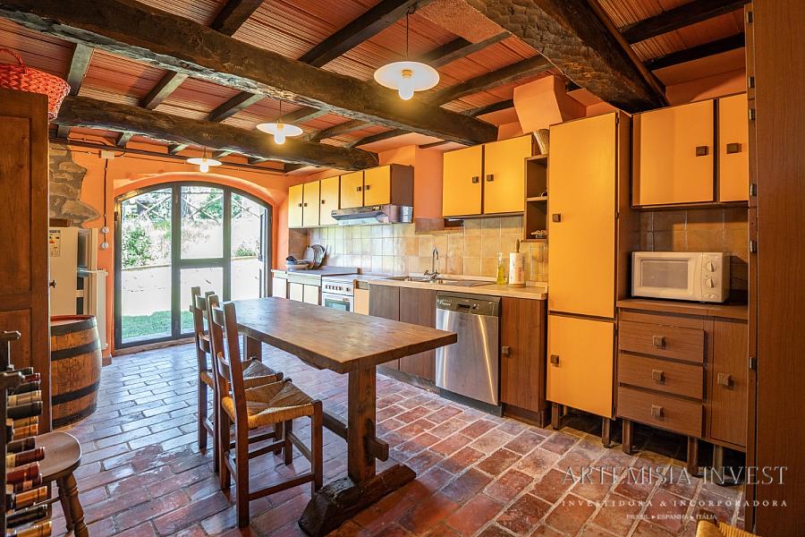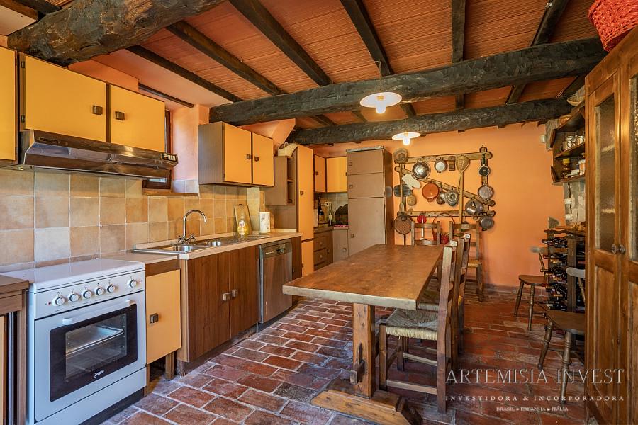 A casa de campo em pedra apresenta pisos de terracota, tetos com vigas de madeira e ladrilhos de terracota, duas lareiras (uma em cada andar), arcos de tijolos e uma escada de pedra.