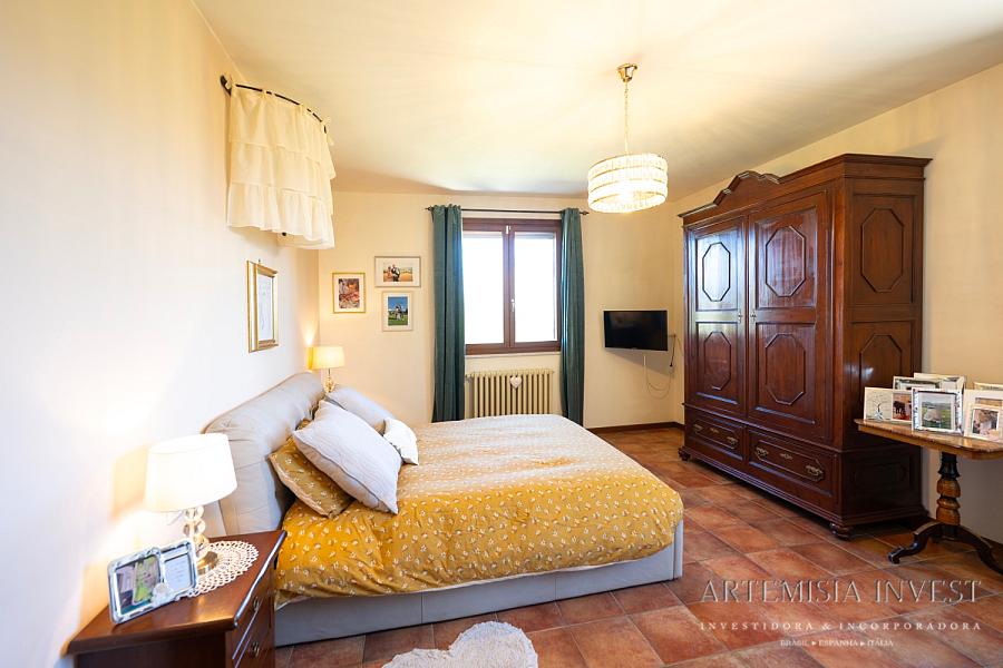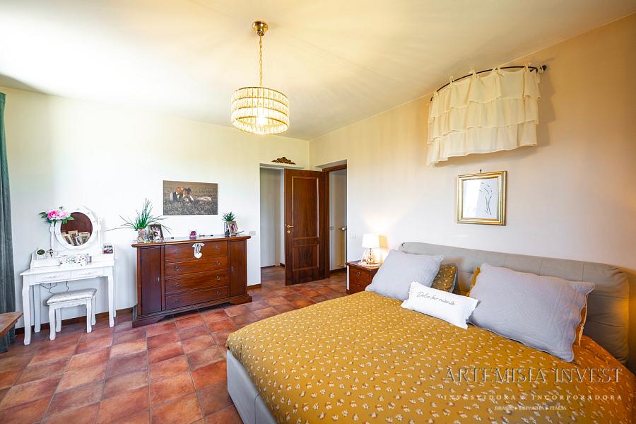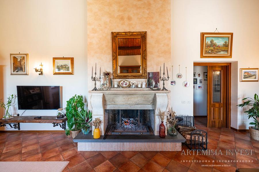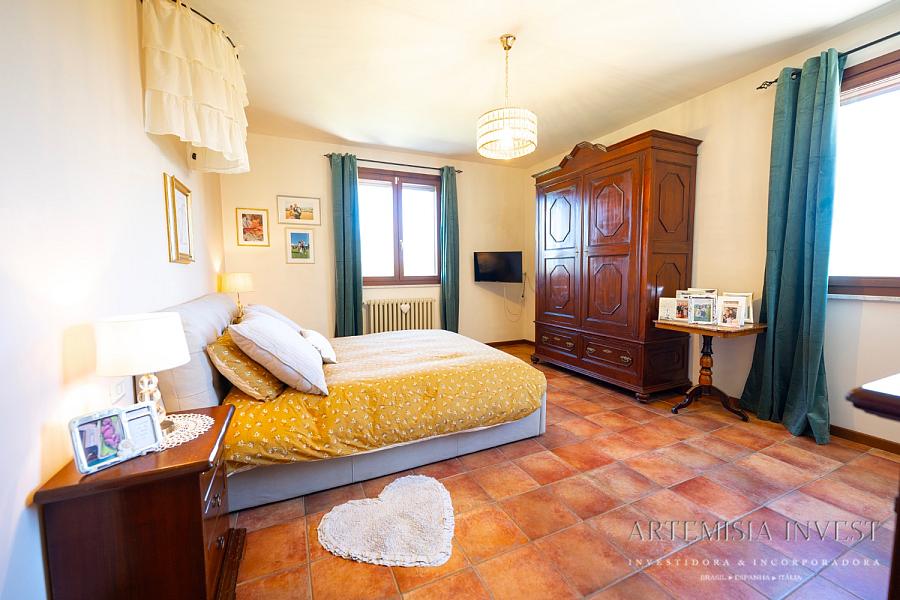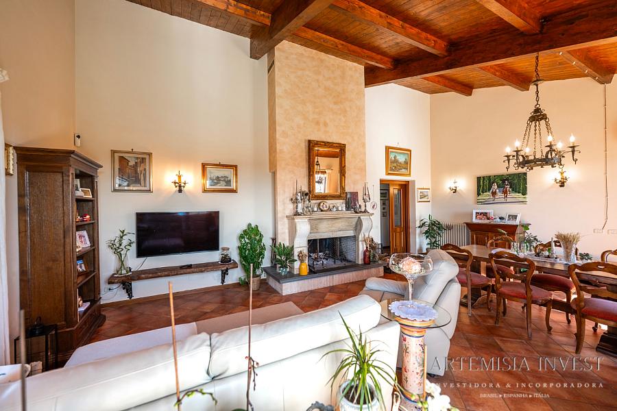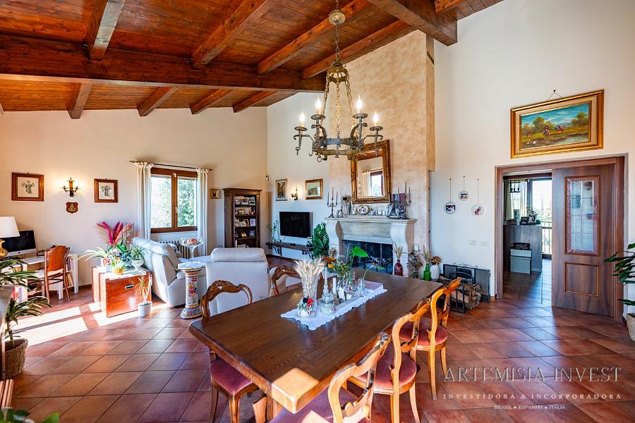No térreo, atualmente utilizado como adega e depósitos, é possível criar um amplo salão rústico com cozinha, ideal para receber amigos e familiares em um ambiente acolhedor e íntimo. Além disso, o espaço permite a criação de dois quartos e um banheiro. A varanda de 50 m² oferece um ambiente agradável para aproveitar o espaço externo em todas as estações do ano.